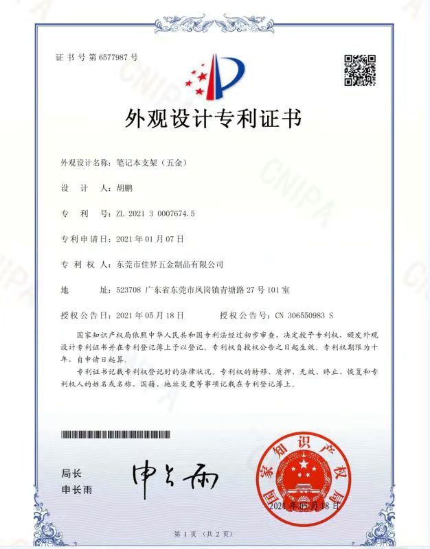 ◆ 專利權: 擁有8項由國家知識產權局頒發的外觀設計專利證書